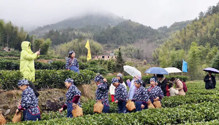 活动现场,数十位身着蓝花衣的客家婆姨挎着小竹篮,穿梭于茶垄间,娴熟地将鲜叶采下枝头。