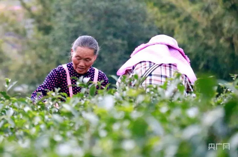 当地茶农正娴熟地采摘鲜嫩茶芽(央广网记者 郇康新 摄)