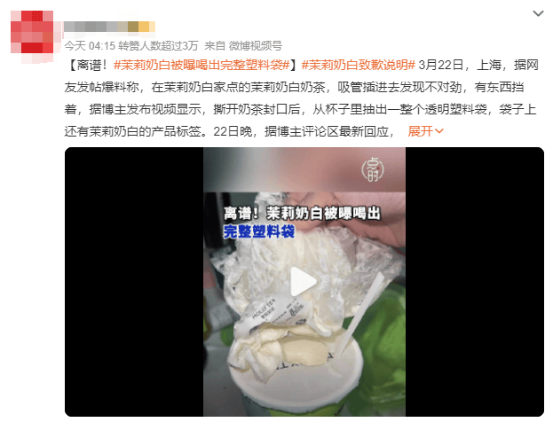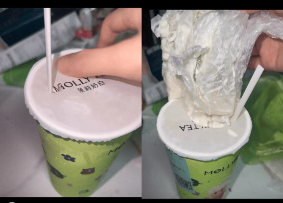 近日,有网友发帖称,在茉莉奶白家点的奶茶,吸管插进去发现不对劲,有东西挡着,据博主发布视频显示, 撕开奶茶封口后,从杯子里抽出一整个透明塑料袋,袋子上还有茉莉奶白的产品标签。