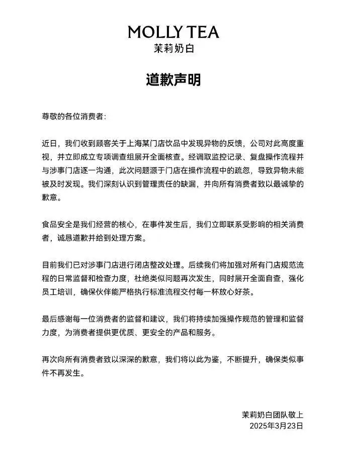 23日晚,茉莉奶白官方微博针对此事发布致歉声明。声明显示,近日,公司对此高度重视,并立即成立专项调查组展开全面核查。经调取监控记录、复盘操作流程并与涉事门店逐一沟通, 此次问题源于门店在操作流程中的疏忽,导致异物未能被及时发现,“我们深刻认识到管理责任的缺漏,并向所有消费者致以最诚挚的歉意”。