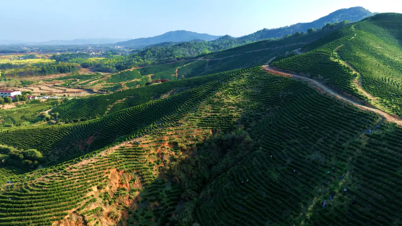 这片生机盎然的茶山,十多年前却是荆棘遍野的荒坡。2012年11月,湖口县启动“坡改梯”工程,将其改造成高标准茶园。经过10多年的发展,建成的茶园不仅锁住了水土,更盘活了民生,实现生态效益和经济效益双赢。