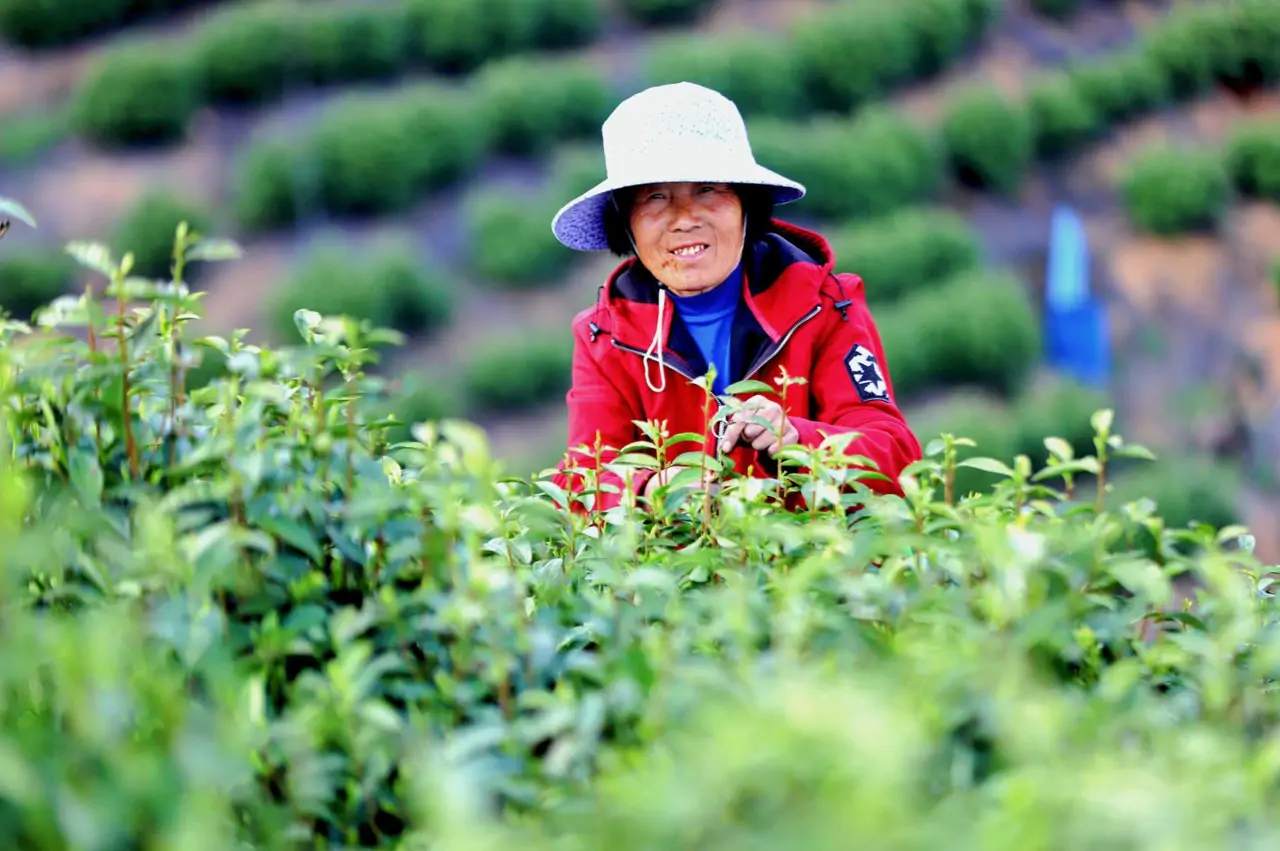 未及山腰,远远便听见采茶人的阵阵欢笑声。年近七旬的沈赛英是老山村村民,布满岁月纹路的手指在茶树冠顶翻飞如蝶,精准摘取两叶一芽的翡翠嫩尖。“我一个人在家,过来采茶既能增加收入,又能同老姊妹们说说话,还能锻炼身体,这满山春色最是养人哩!”沙沙的采撷声中,老人眼角的笑纹与掌中鲜叶一同舒展。