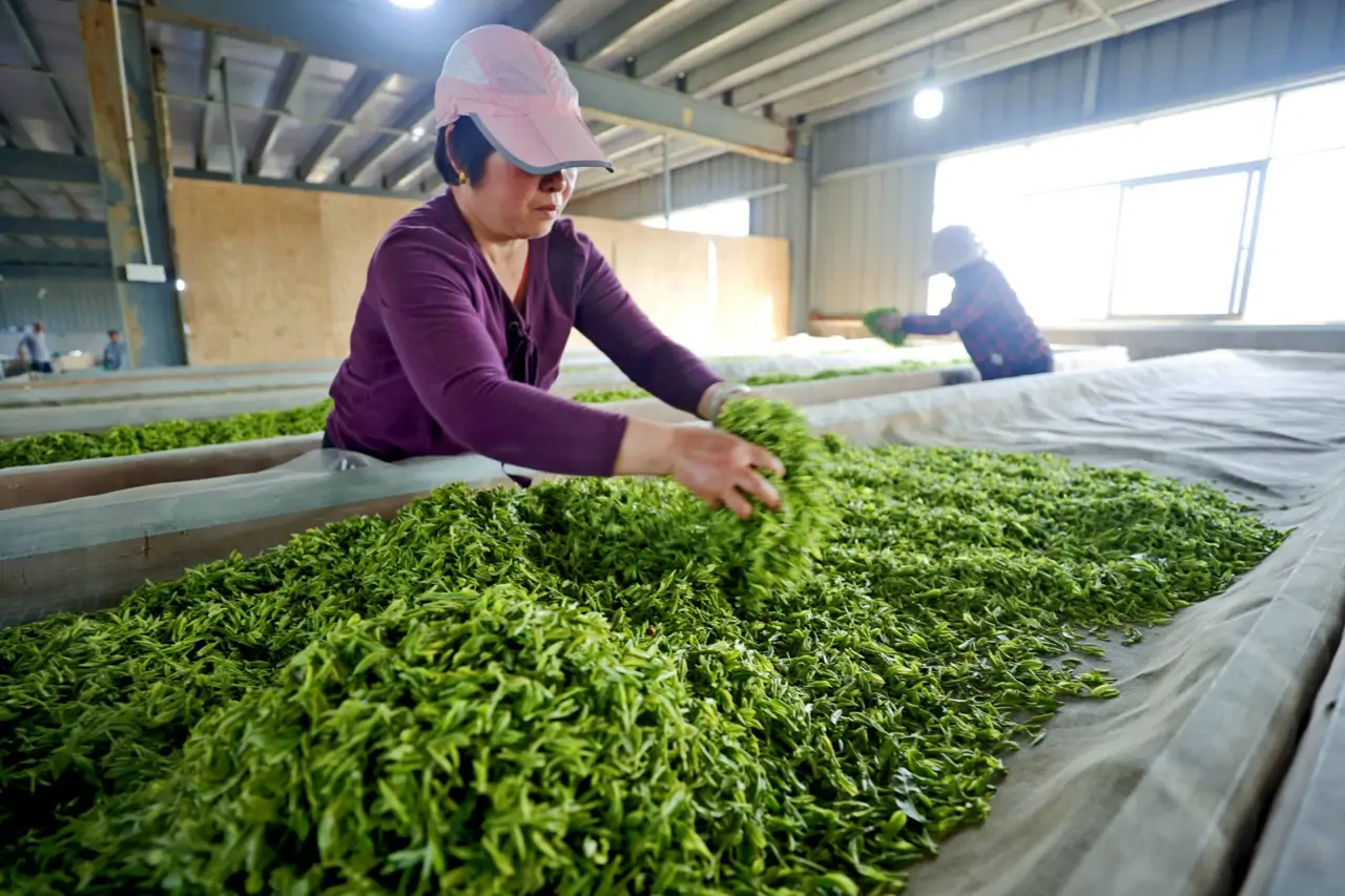 春风拂过鄱阳湖畔,江西九江湖口县两万余亩茶园里满目新绿。3月25日,在湖口县流芳乡老山村高标准茶场,头戴帽子、腰挎竹篓的采茶工们,手指轻捻,将嫩绿的一芽一叶采摘下来,收入篓中,空气里浮动着清冽的茶香。