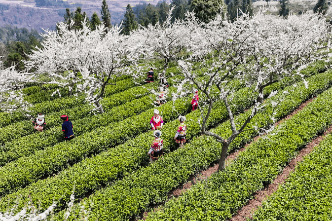 近日,福泉市陆坪镇福兴村牛滚凼茶园内的李花竞相绽放,洁白如雪的李花与翠绿的茶垄相互映衬,勾勒出一幅如诗如画的田园美景。当地举办了以“党建引领产业振兴,绘就宜居宜业和美乡村新画卷”为主题的李花节,将文艺演出、茶园赏花和采摘等特色活动融为一体,吸引了众多游客前来参与。