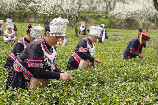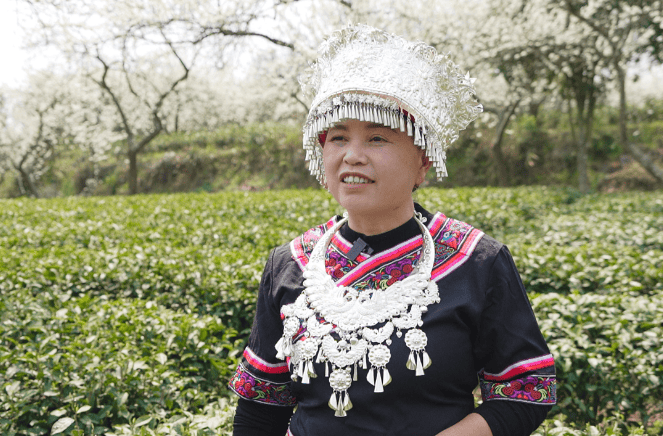 村民唐兰说:“李花都开了,这个季节我们都在采茶,是丰收的季节。每年这个季节,远方的客人都到我们这里来玩。现在发展好了,家家都过上比以前更好的生活,心情好了什么都好,除了采茶,就唱歌跳舞。”