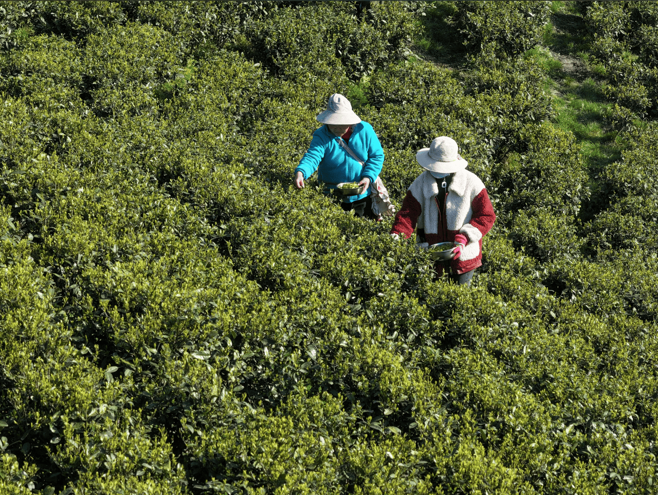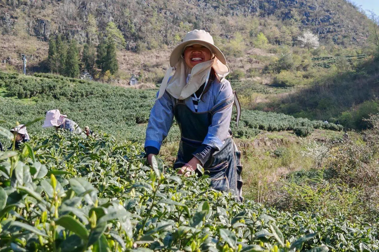 3月25日上午9时,阳光明媚,记者一行驱车从保基乡冷风社区居委活动室往垤腊村茶叶基地前行,一路上繁花似锦,满眼春绿,还未走近茶园,耳边已传来一阵悦耳、清脆的山歌声。远远望去,200余亩茶树吐露的新芽鲜嫩欲滴,一簇簇、一垄垄茶树郁郁葱葱、绵延起伏,散发出淡淡的清香,采茶工人们散布茶树之间,他们头戴遮阳帽、腰挎竹篓,手指在茶丛中灵巧翻飞,动作娴熟地将嫩绿的新芽采摘入篓,茶园内一派丰收忙碌景象。