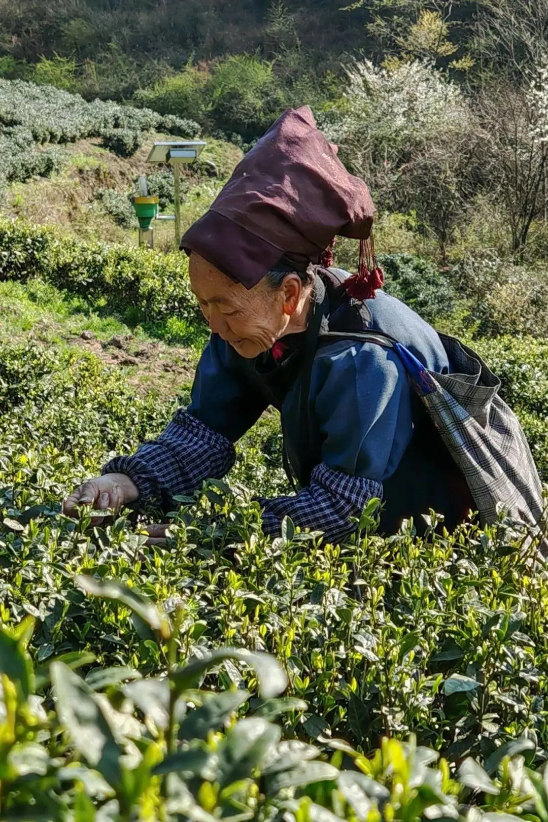 在茶园里的另外一个区域,来自保基邻乡的羊场乡瞿家寨村村民段学凤和已经60多岁的赶场坡村村民潘芳敏蹲在茶垅间,两人动作娴熟,拇指与食指轻轻一捻,一芽一叶的嫩梢便落入掌中。