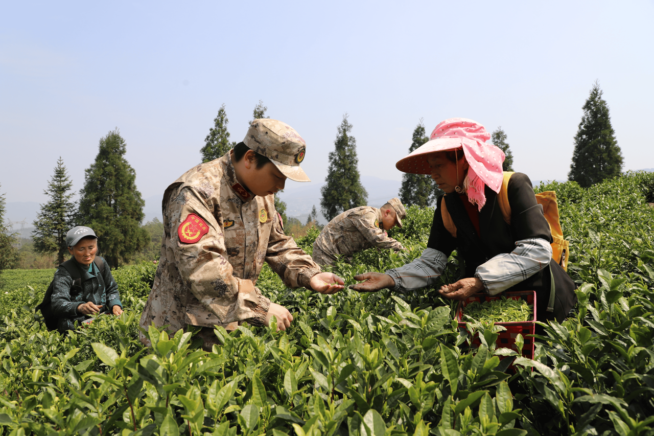 “采茶时要用拇指和食指揪住网上提,是个细致活,熟能生巧……”清明前夕,六盘水市水城区龙场乡茶叶种植基地满园青绿,基干民兵正忙着和种植户一道采制首批春茶,保障群众稳产稳收。