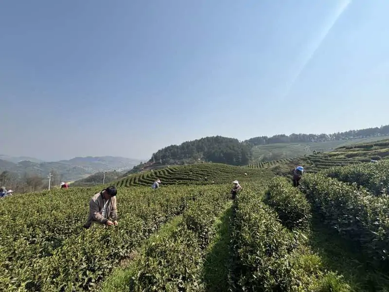 连绵起伏的茶山上,片片鲜嫩的茶叶沐浴在晨光里,泛着绿油油的光泽。200多名采茶工人腰挎茶篓,穿梭在一行行茶垄间,手指在茶树上不停翻飞,娴熟地将一片片嫩芽采入篓中。
