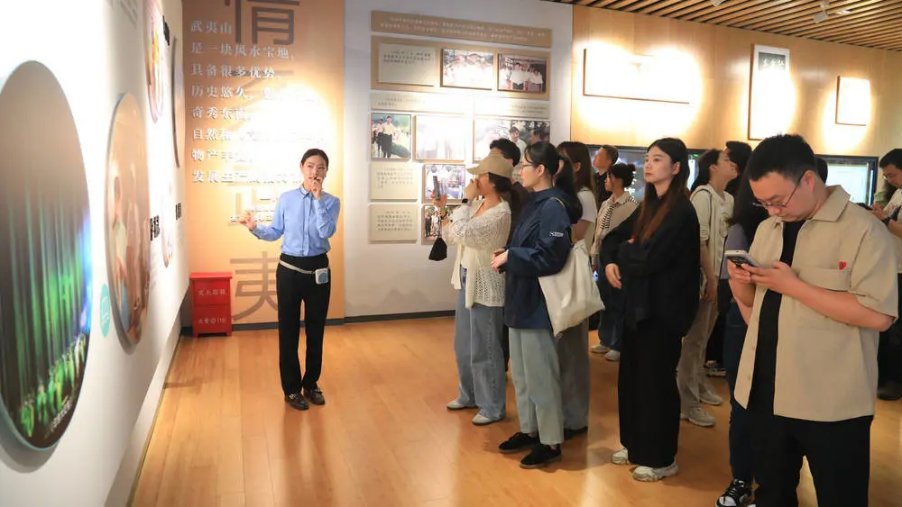 而那座崭新的三茶展示馆,就静静地矗立在这片绿色的海洋边,等待着人们去揭开它的神秘面纱。馆内的布展内容丰富多样,以武夷山茶的历史、发展成就和规划为主线,兼具文化科普、互动体验、成果展示等多重功能。在文化科普区域,记者了解到武夷岩茶独特的“岩骨花香”。原来,岩茶的香气来源于茶树生长在特殊的岩石土壤中,这种土壤赋予了茶叶独特的矿物质风味;而岩骨则是指茶叶在烘焙过程中形成的一种坚硬而有质感的口感,它代表了岩茶的核心特征。这些知识让我对武夷岩茶有了更深的认识和理解。