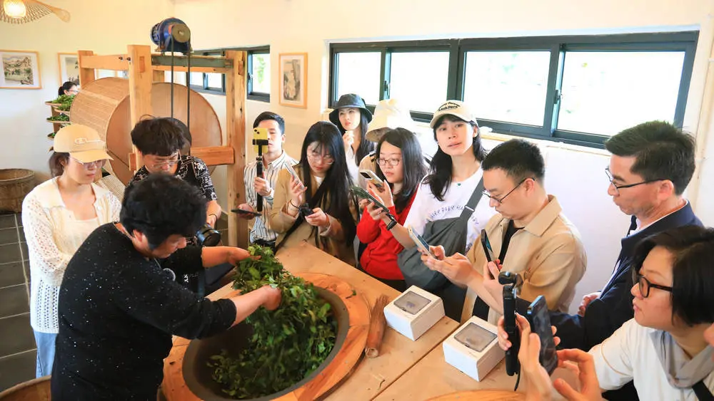 非物质文化遗产武夷岩茶(大红袍)制作技艺传承人游玉琼带领媒体记者体验炒茶 潮新闻记者 朱骅超摄