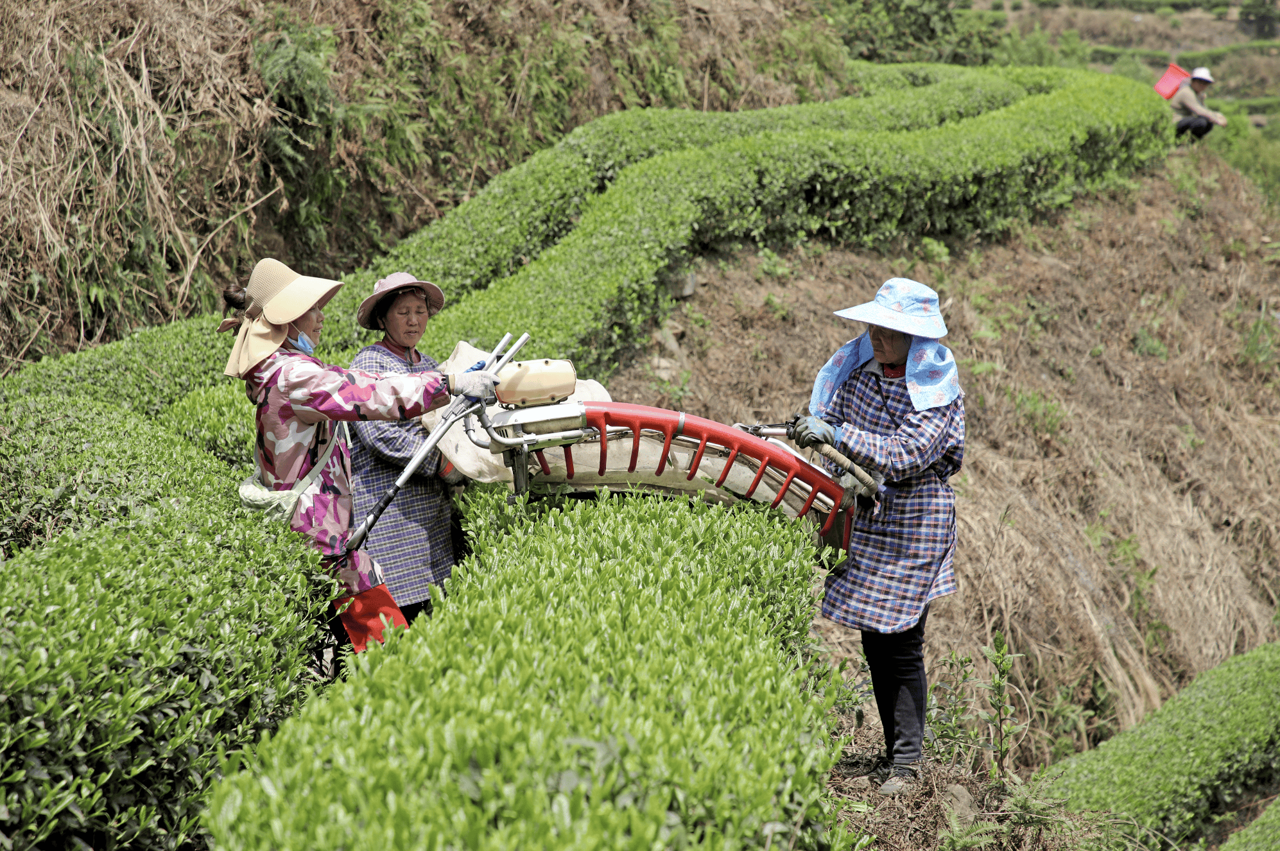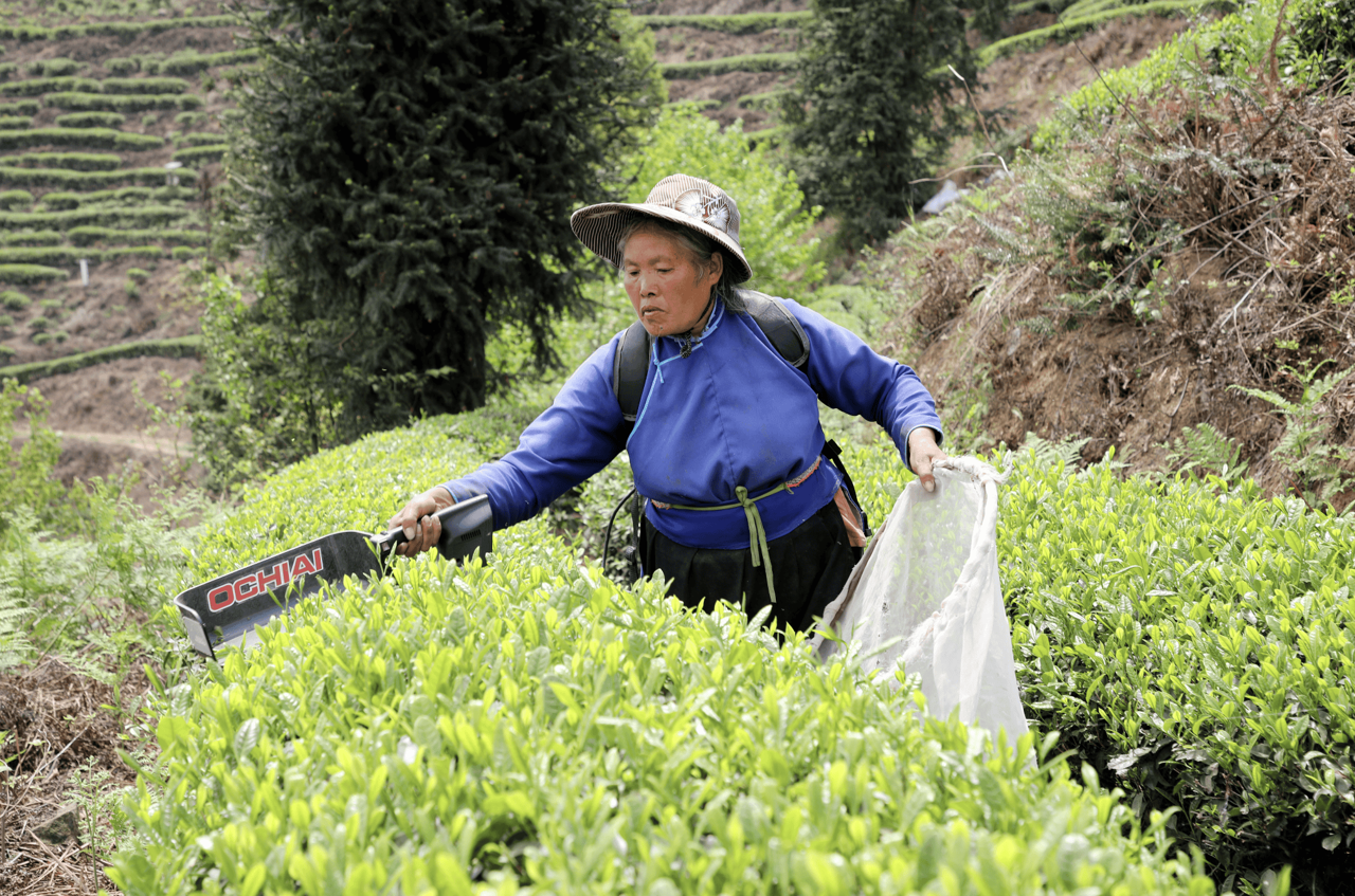 2023年,为了解决人手不足问题,茶场引入了机器设备采摘茶叶。“目前有单人式、双人式两种类型。除了明前茶还是需要纯手工采摘,春茶、夏秋茶都可以用设备来帮忙。单人式每天最多可以采900斤左右,每斤茶青按照0.35元收购;双人式最多采近2000斤,按照每台机器160元一天支付他们的工钱。”