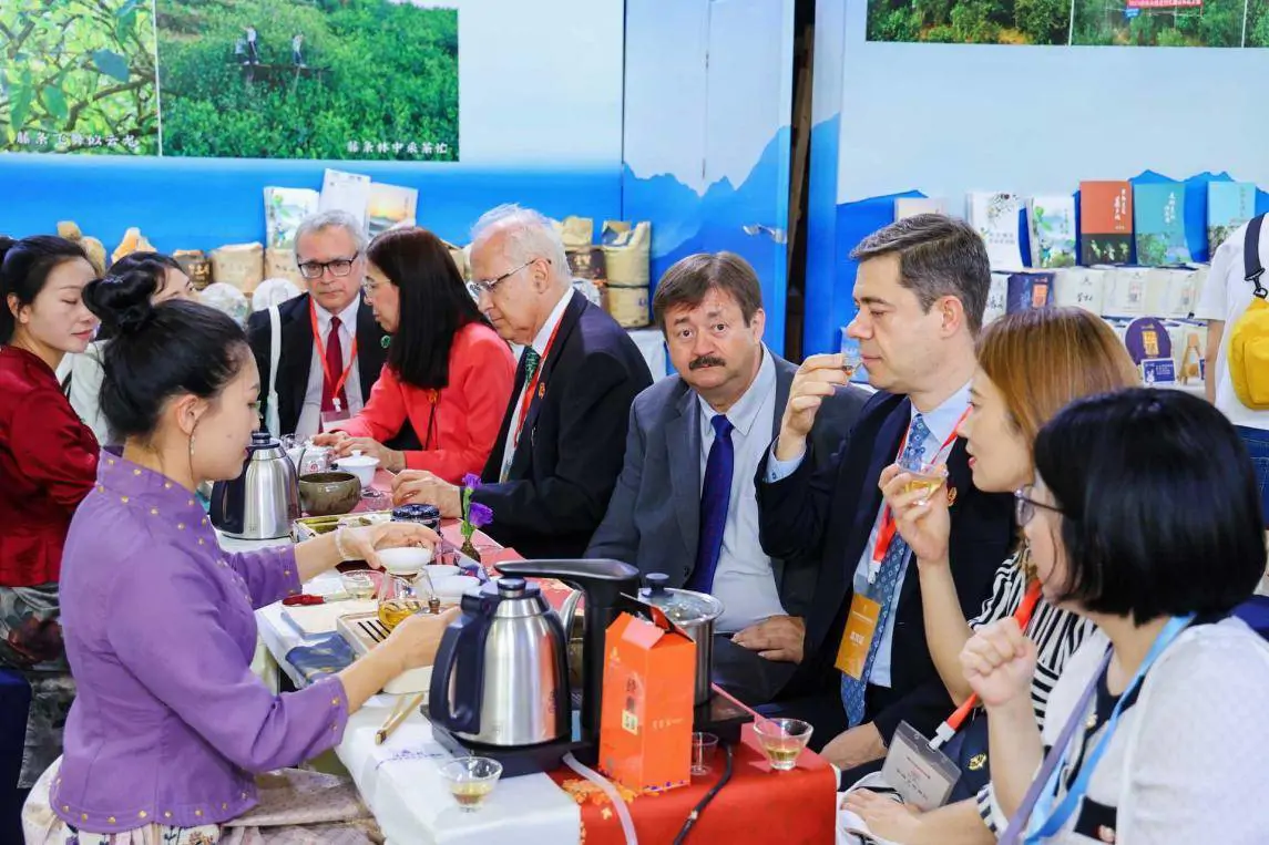 国际采购商在第十四届四川国际茶博会现场品茶、洽谈。成都市博览局供图