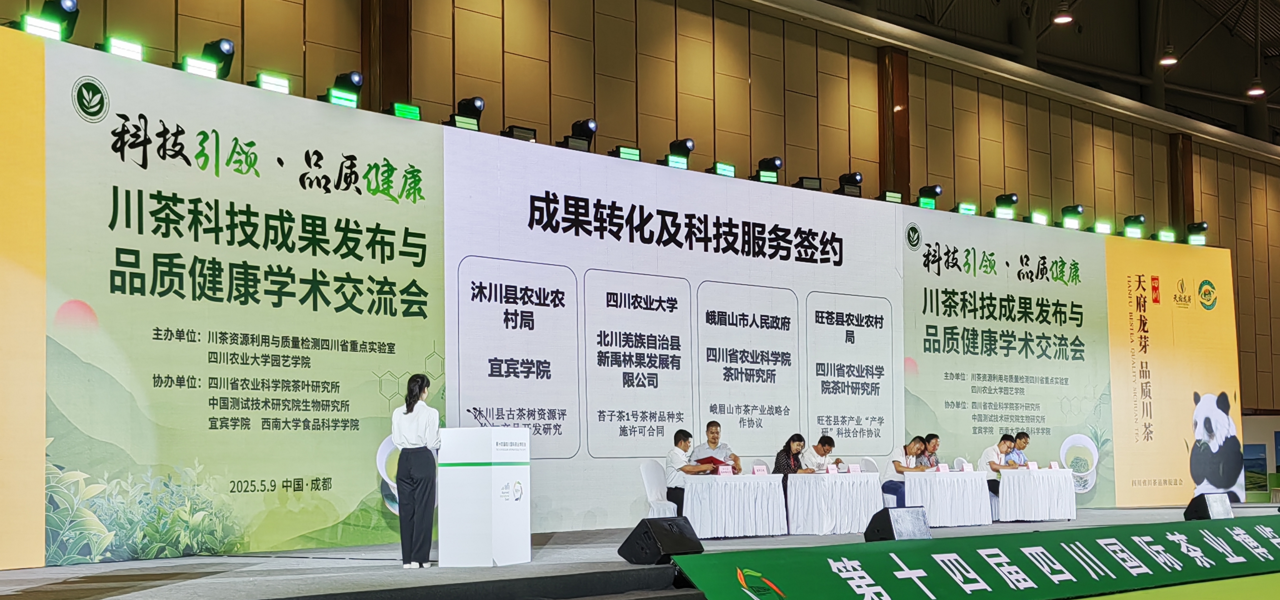 活动还现场举行了“川茶科技成果转化及技术服务签约仪式”,川茶资源利用与质量检测四川省重点实验室各科研团队分别与峨眉山市人民政府,沐川县、马边县、旺苍县农业农村局,以及自贡市春兰茶业有限公司、四川印象川之味茶叶有限责任公司、北川羌族自治县新禹林果发展有限公司等川茶产业链主、链属企业签订新品种授权转让、技术转化和科技服务合作协议,为各地茶产业链发展提供科技支撑。此外,交流会还展示了四川农业大学在茶学本科和研究生人才培养方面的成效。