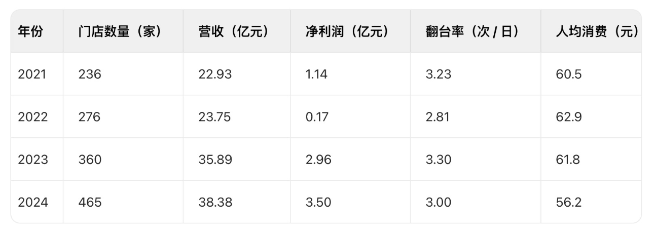 在2021年至2024年,它的营收虽然在稳步扩张,分别实现22.93亿元、23.75亿元、35.89亿元、38.38亿元;同期净利润分别为1.14亿元、1657.9万元、2.96亿元和3.5亿元。但实际上,它的营收的增长主要靠门店的扩张来驱动——同期,绿茶的新开餐厅数量分别为59家、47家、89家和120家,关闭餐厅为3家、7家、5家和15家。
