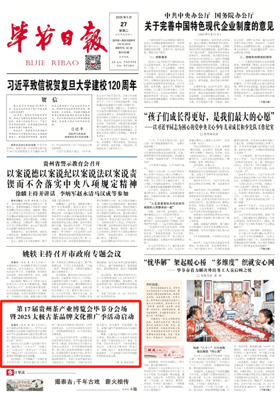 5月23日,由中国农业电影电视中心、毕节市人民政府联合主办的第17届贵州茶产业博览会毕节分会场暨2025太极古茶品牌文化推广季活动启动仪式在七星关区同心城市公园广场举行。