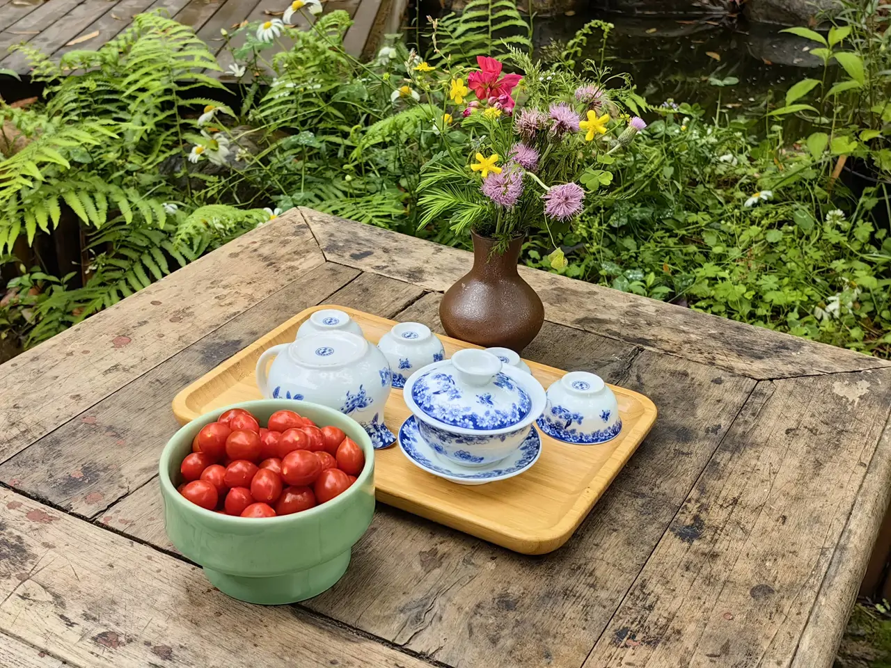 桃树、梨树、李树、杨梅树、枇杷树等果树环绕四周,绿意盎然;茉莉花、石榴花、水仙花、绣球花等花卉随风摇曳,惹人怜爱;问茶、碧霞、芳华、云华、涤烦子等包房风格各异,不落俗套……5月21日,记者第一次走进“三生有幸”茶馆,就被这里静谧幽雅的“侘寂风格”深深吸引。