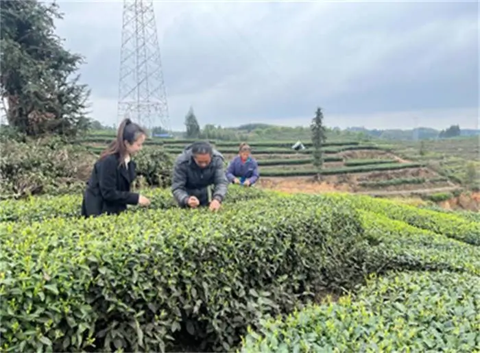 峨眉山支行客户经理上门向茶农了解春茶情况,并学习春茶采摘技巧。建行四川省分行供图